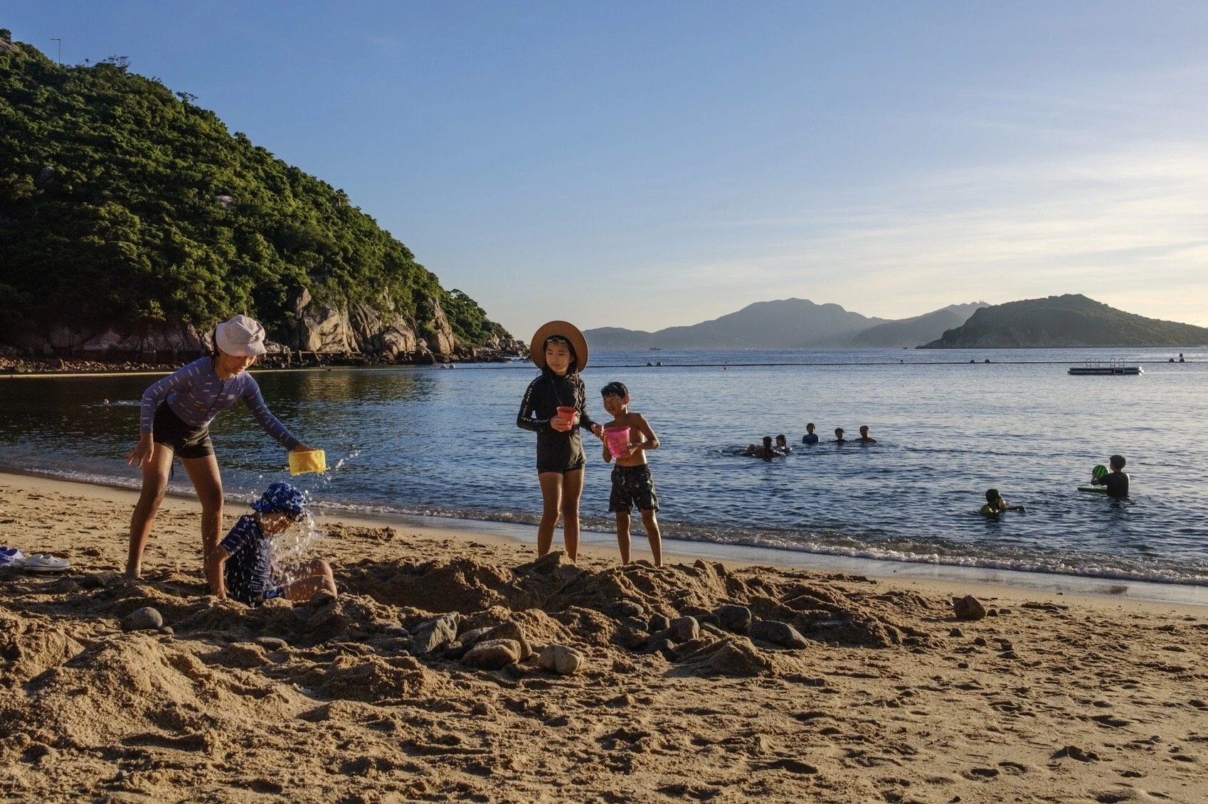 Famille profitant d'une journée à la plage, avec des enfants jouant dans le sable et nageant dans la mer, entourée de montagnes et de soleil