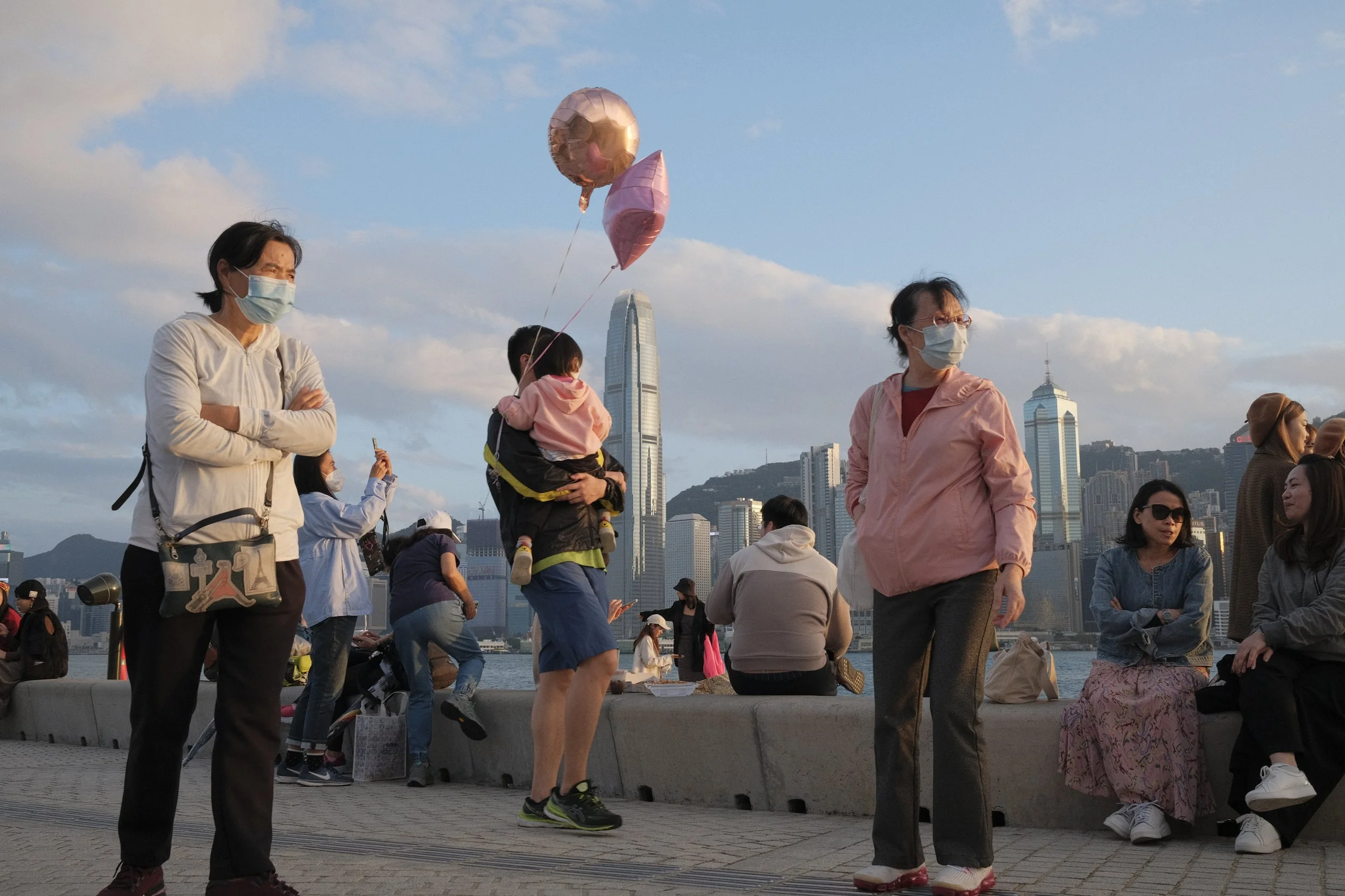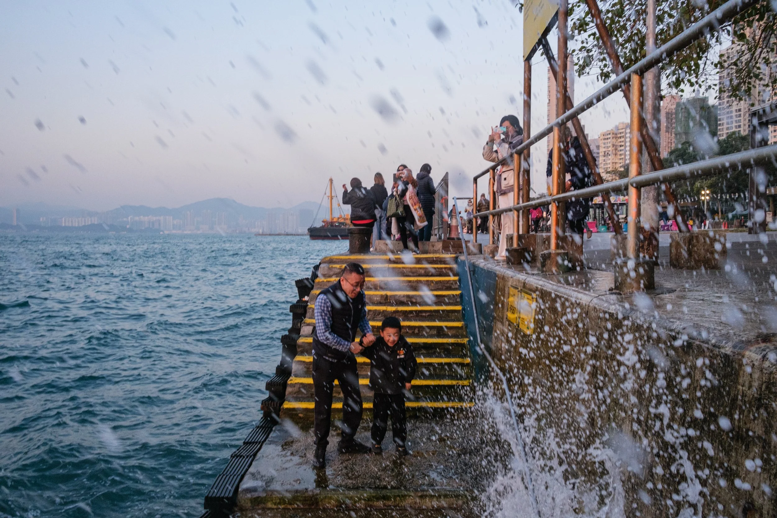 Des personnes, y compris un homme et un enfant, descendent les escaliers d'un quai, la mer en arrière-plan, avec des vagues éclaboussant, en fin d'après-midi ou en début de soirée, à Hong Kong
