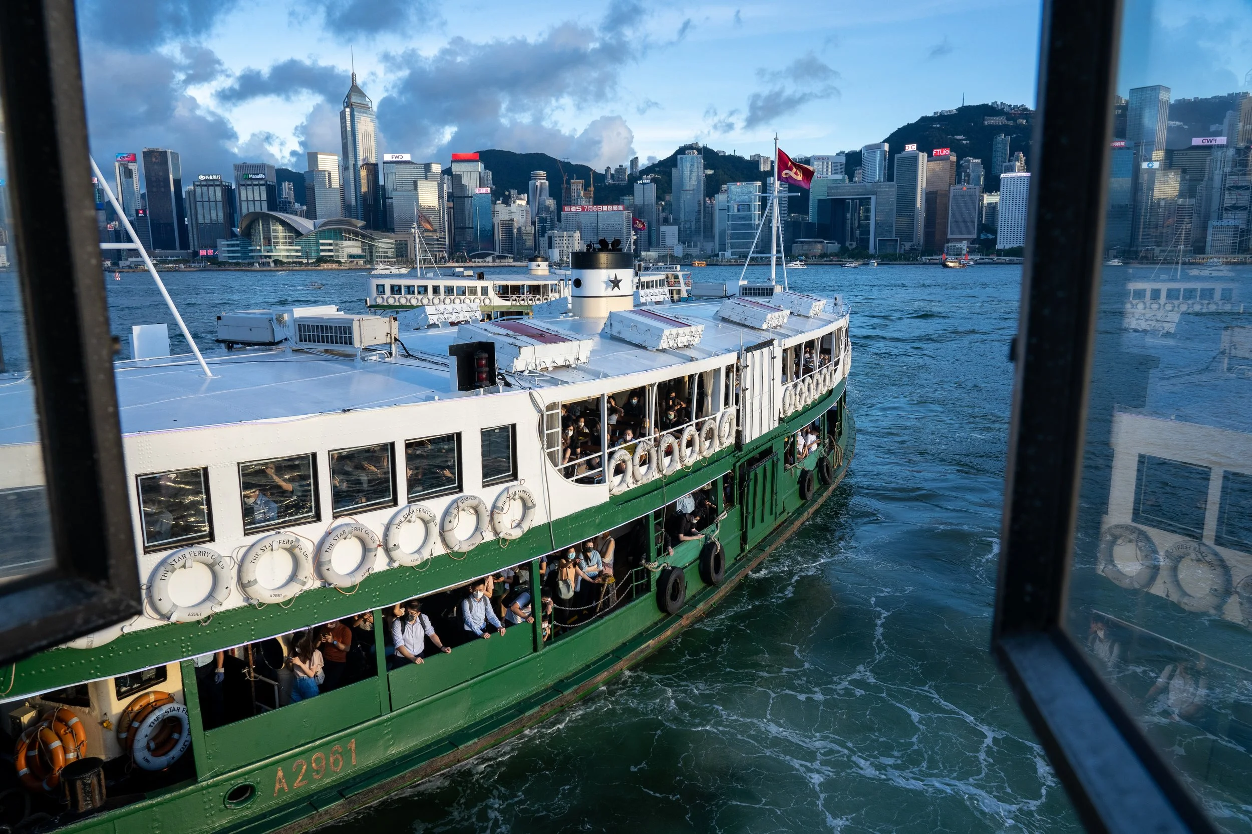 Vue d'une navette ferrée verte et blanche naviguant sur un fleuve, avec la ville de Hong Kong en arrière-plan et des gratte-ciel modernes sous un ciel partiellement nuageux.