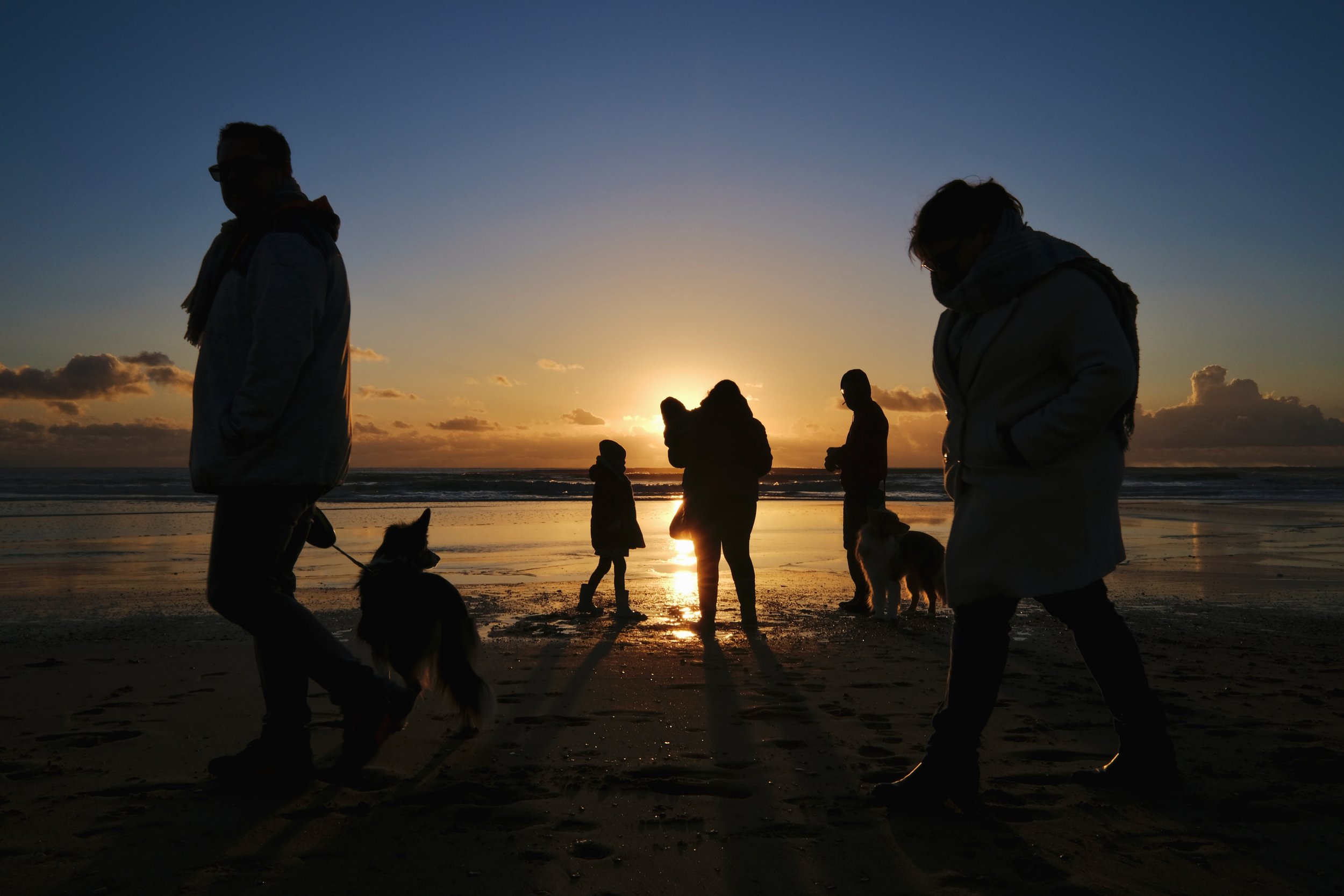 Silhouettes de six personnes et deux chiens sur une plage au coucher du soleil.