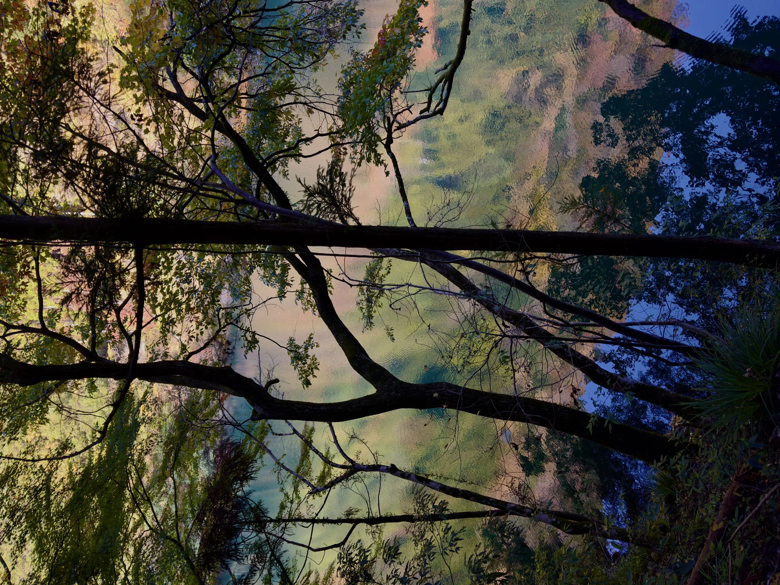 Arbres au bord d'un étang avec reflet de la végétation dans l'eau, sous un ciel nuageux.