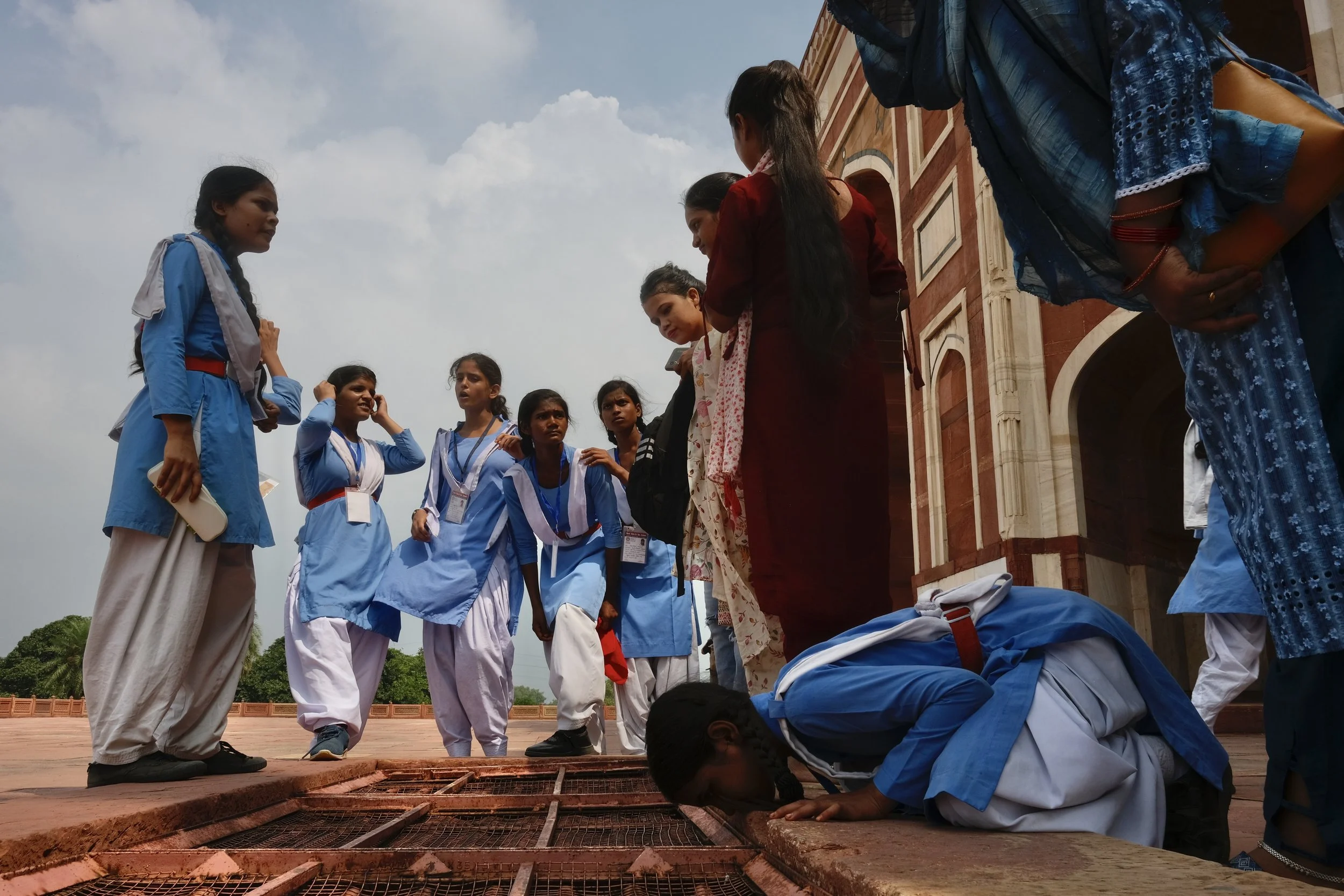 Une jeune fille en uniforme scolaire fait la révérence devant un groupe de jeunes filles en uniforme bleu et blanc, devant un bâtiment historique en Inde, avec un ciel nuageux en arrière-plan.