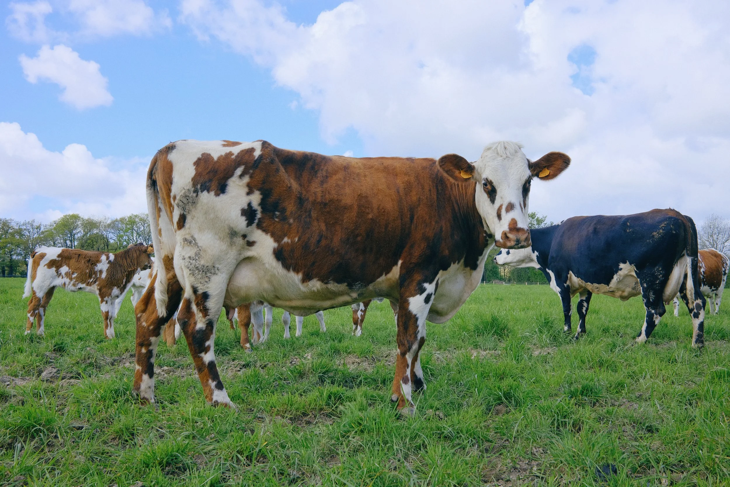 Une vache brune et blanche regarde la caméra dans un champ à l'aube ou au crépuscule, avec d'autres vaches au loin et un ciel coloré en arrière-plan.