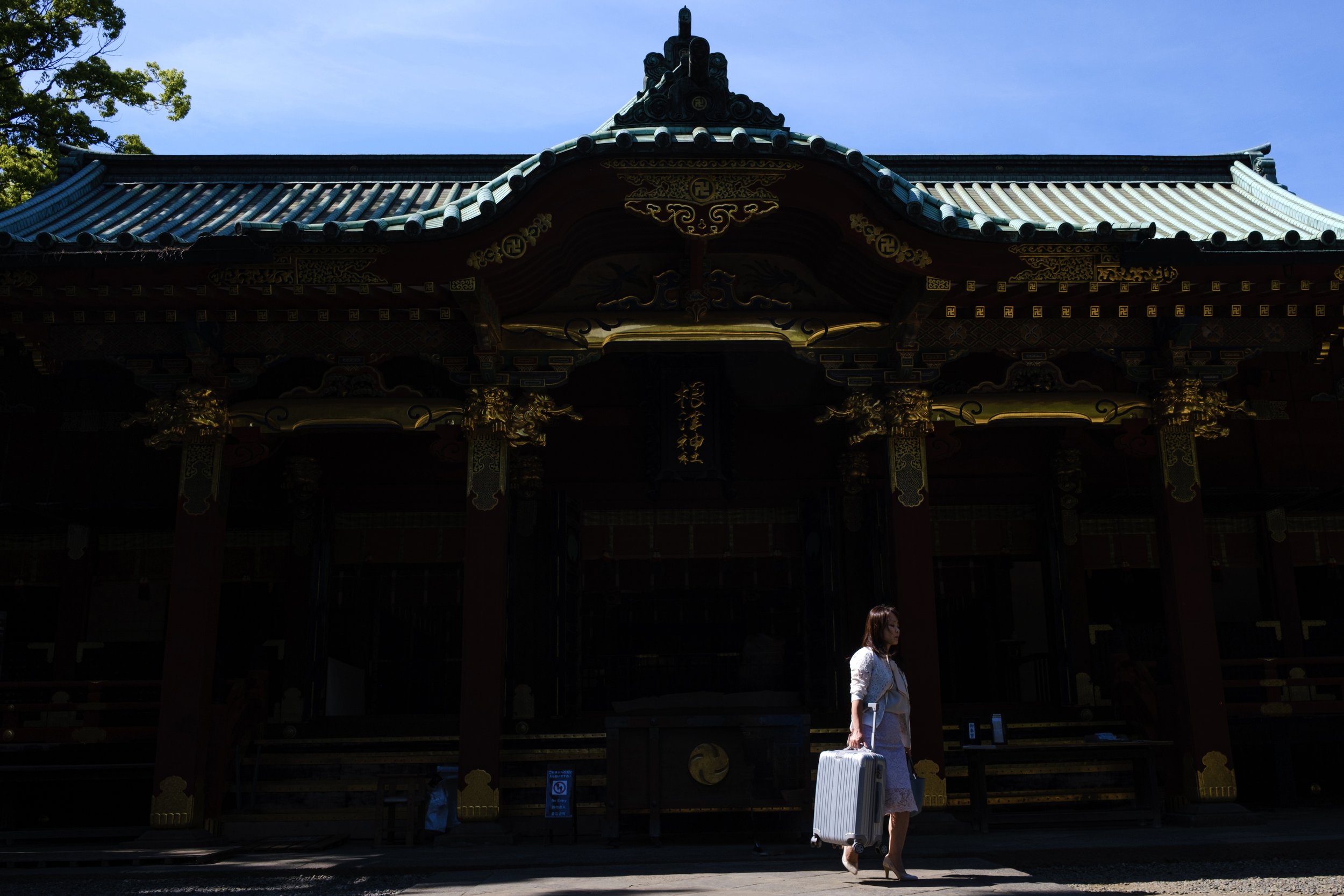 Une femme avec une valise en marche devant un bâtiment architectural japonais traditionel, sous un ciel bleu.