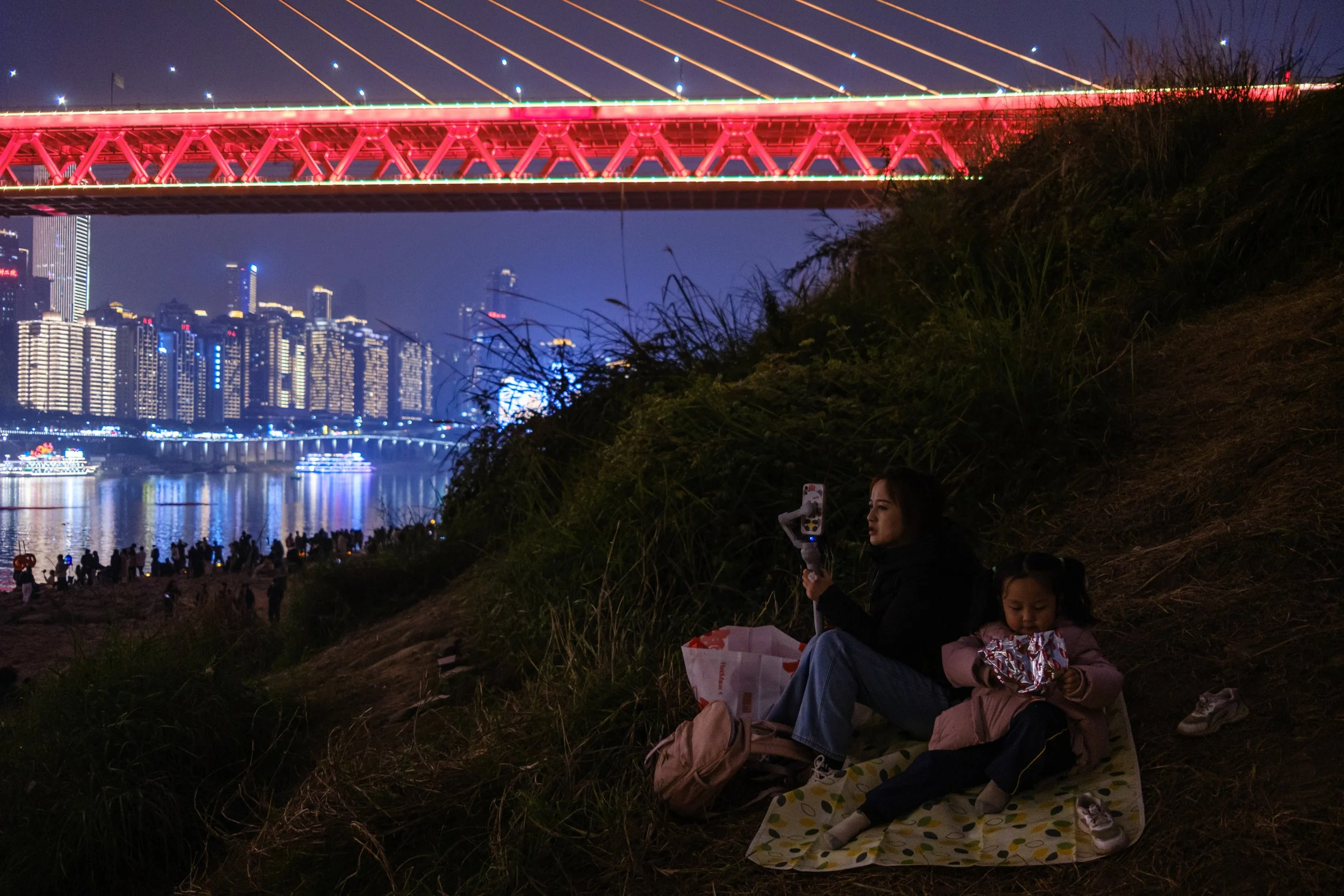 Une femme et une enfant assises sur une couverture au bord d'une rivière la nuit, regardant les feux d'artifice et un pont illuminé en arrière-plan, à Chongqing en Chine