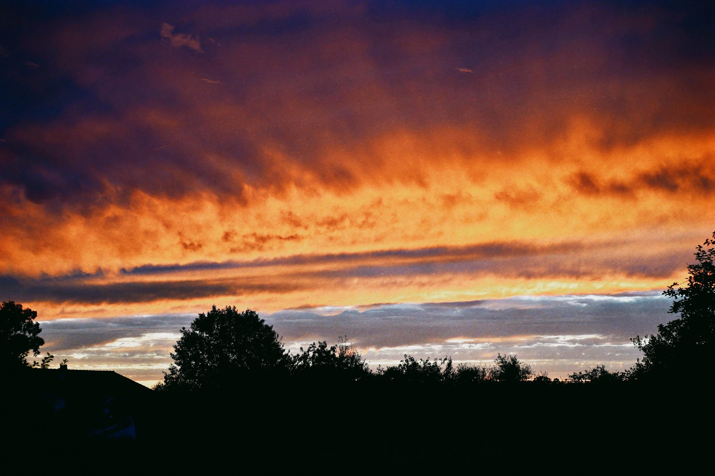 Ciel de coucher de soleil avec des nuages orange, rose et gris au-dessus de silhouettes d'arbres et de maisons.
