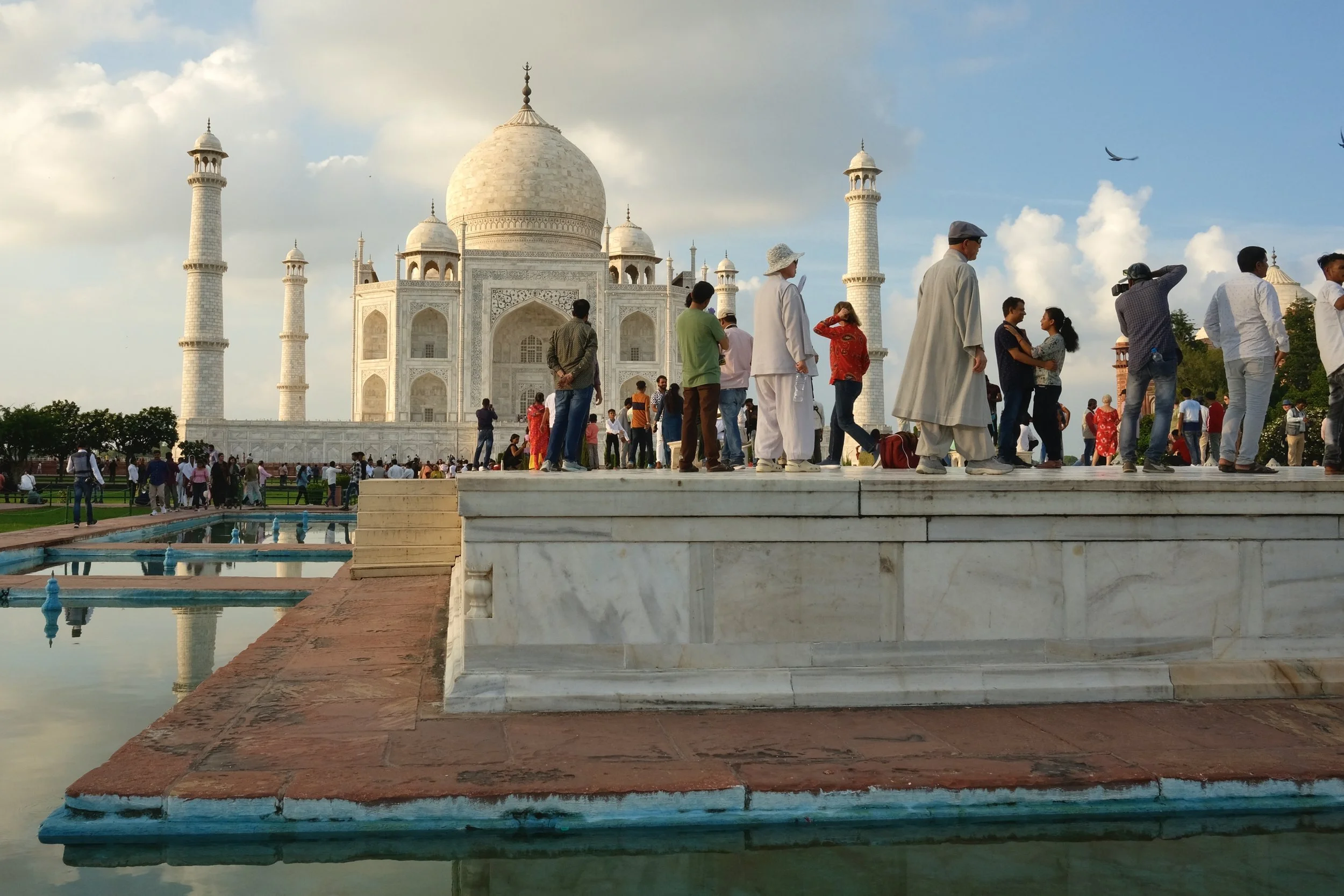 Vue du Taj Mahal avec des touristes en avant-plan, certains prenant des photos, sous un ciel partiellement nuageux.