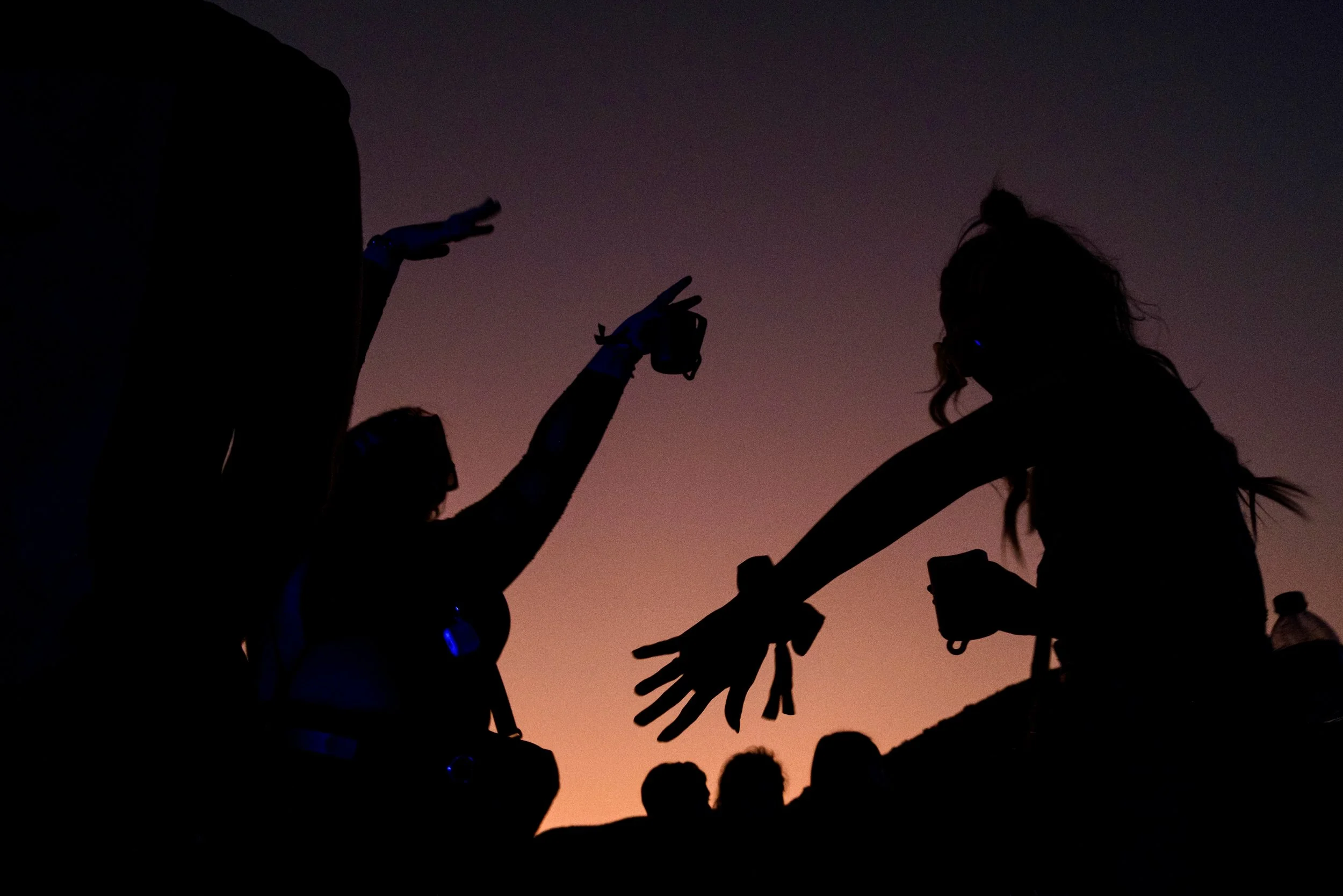 Fête en plein air avec un grand groupe de personnes, dont certaines portent des vêtements d'été, et une personne qui utilise un éventail oriental. La scène se déroule à la tombée de la nuit ou en début de soirée.