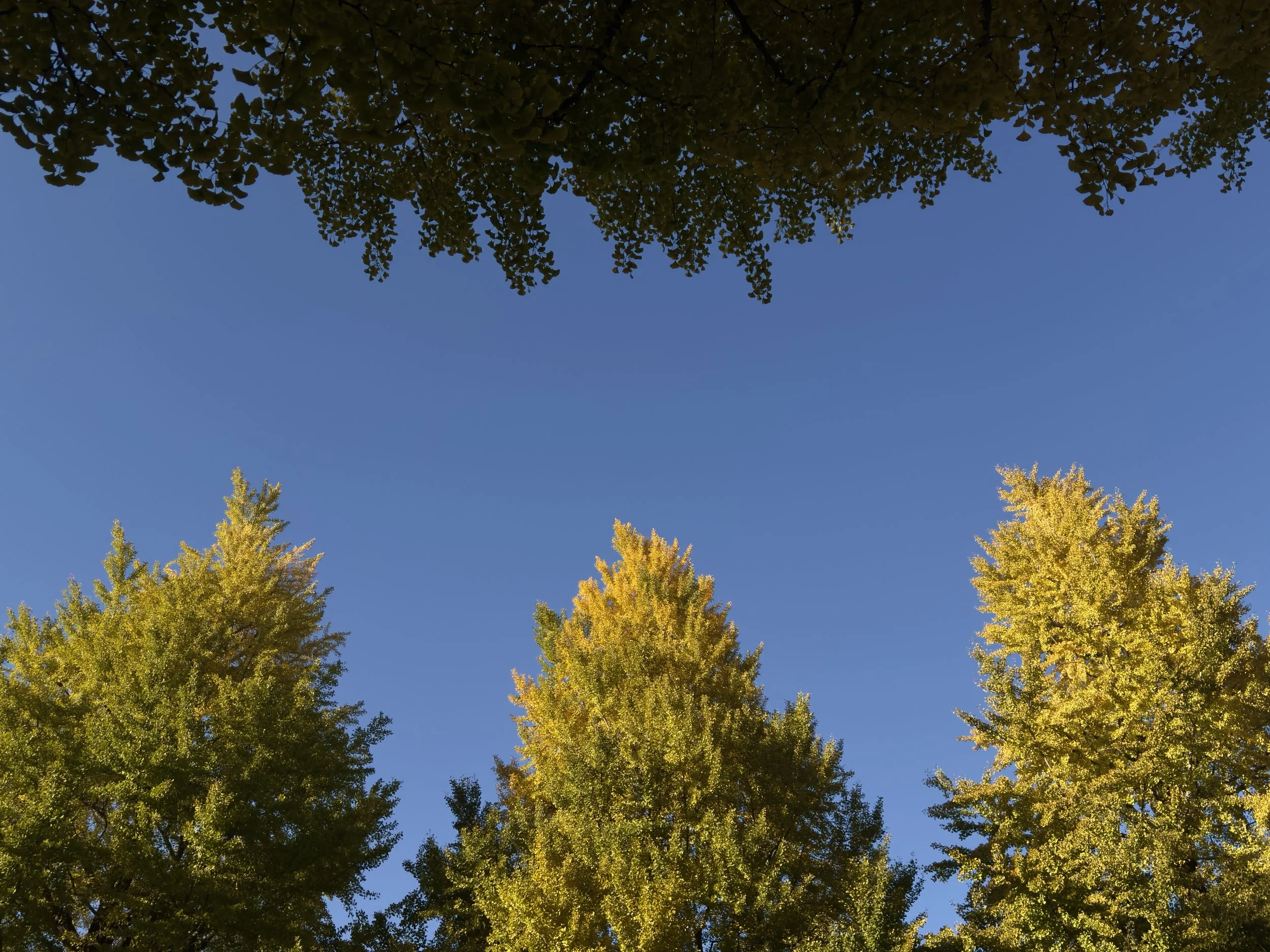 Ciel bleu vu à travers le sommet des arbres en automne avec des feuilles jaunes et vertes.