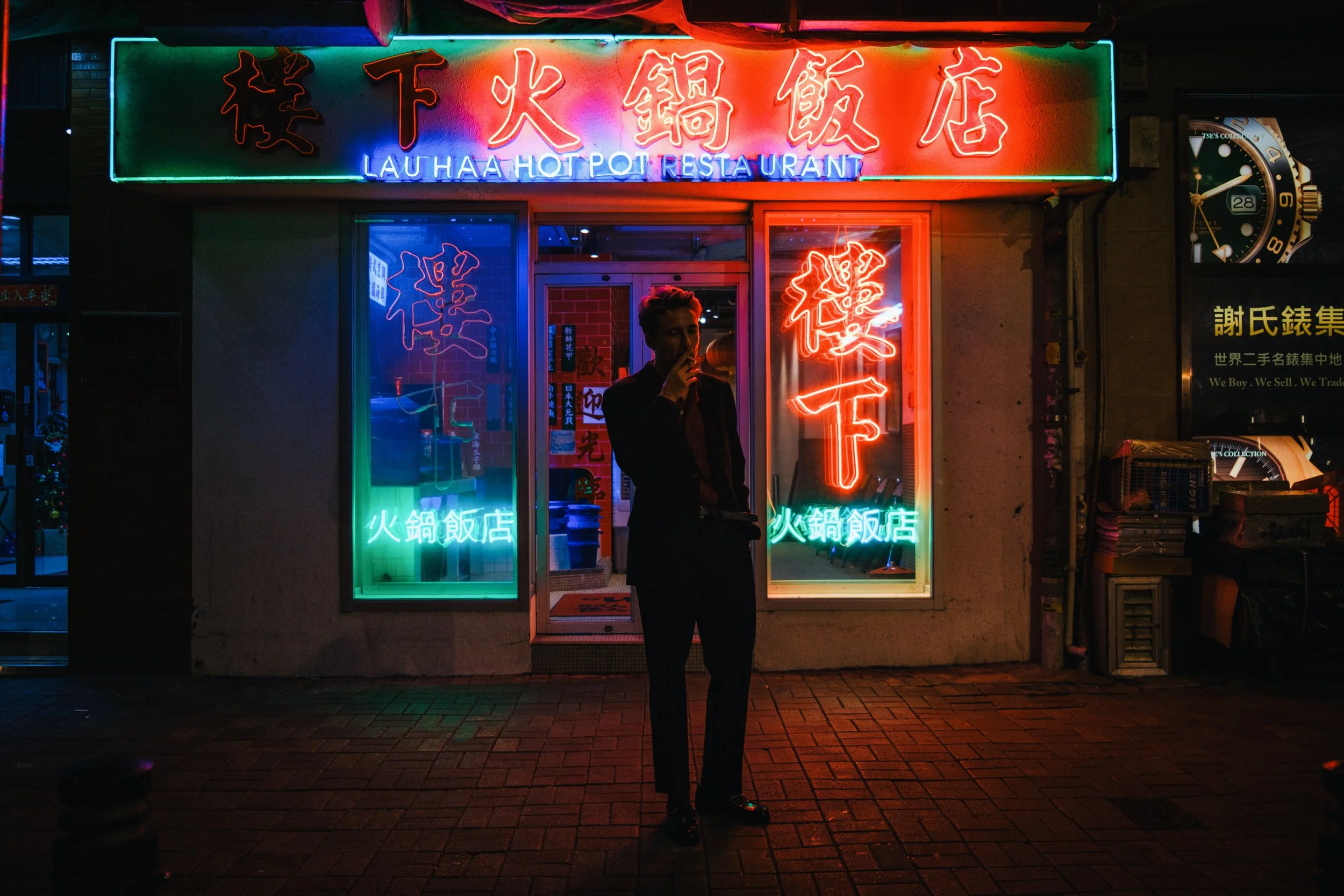 Un homme en costume noir fume devant un restaurant éclairé par des néons rouges, verts et bleus avec des caractères chinois et en anglais. La porte est en verre et l'intérieur est lumineux avec des décorations chinoises.