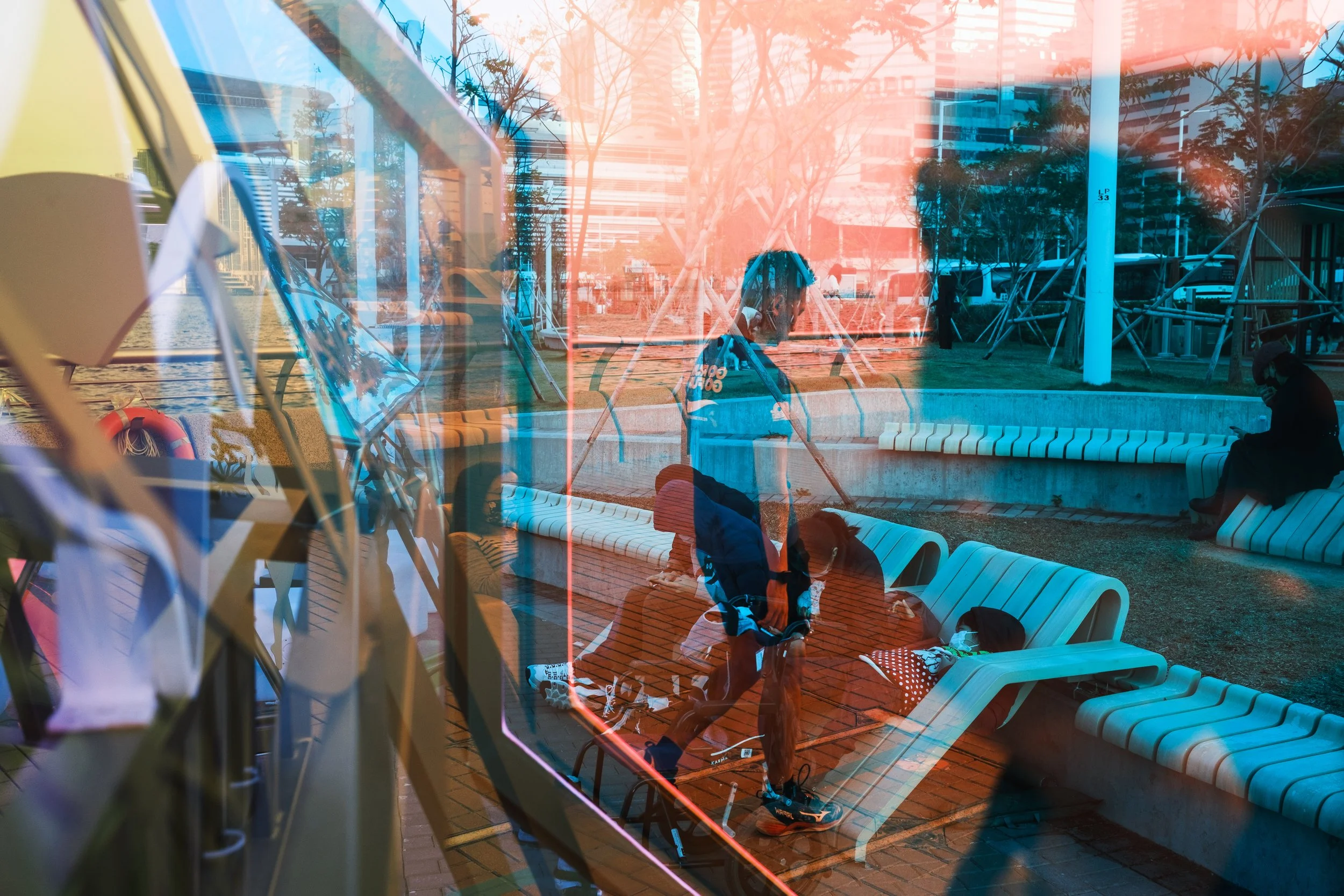 Reflet d'un homme ajustant son vélo sur des bancs en plastique dans une zone extérieure de parc ou de lieu public, avec des arbres et des structures en arrière-plan, visible à travers une fenêtre, au bord de la baie de Victoria à Hong Kong