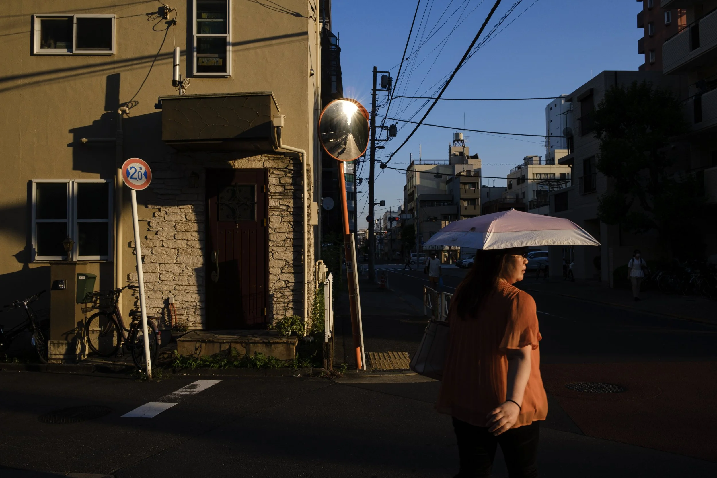 Une femme portant un chapeau de soleil rose et une chemise orange marche sous un parasol blanc dans une rue urbaine au coucher du soleil, avec des bâtiments modernes et des câbles électriques en arrière-plan.